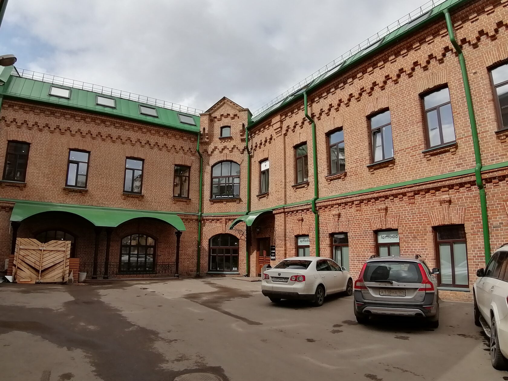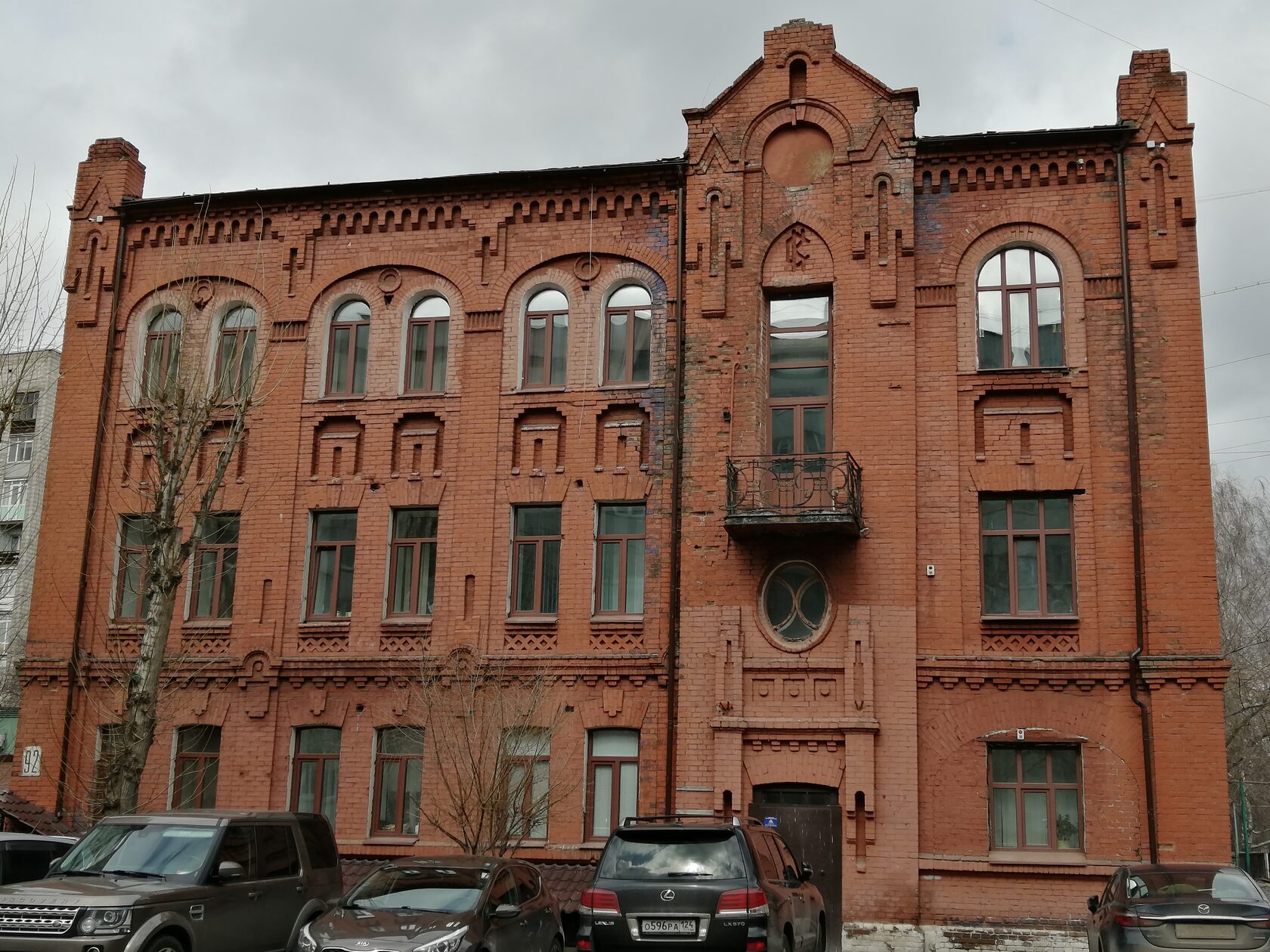 | Симметричный уличный фасад лицевой кладки выкрашен в два цвета. Он расчленен на восемь частей выступами и широкими рустованными лопатками. Раскрепованная 7-осная средняя часть несколько повышена, выступающий в её центре ризалит с проездной аркой и балконной дверью имеет массивное завершение и прямой аттик с круглым проемом. Ризалитами с фигурными аттиками отмечены и крайние оси с парадными входами и балконными дверями. В середине каждого осного звена фасада была дверь в магазины. Высокие окна средней части имеют полуциркульные завершения и такие же сандрики с замками. |
